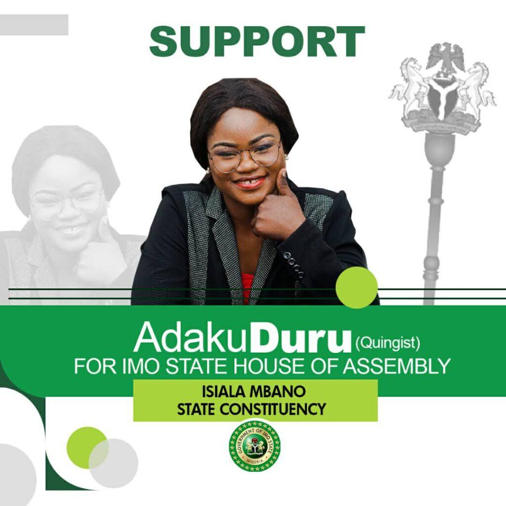 Adaku Duru Eunice aka Quingist is contesting for Imo House of Assembly, Isiala Mbano Constituency come 2023.