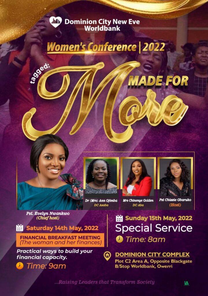 #womenconference2022 Dominion City Worldbank set to host “Made For More” on 14&15th May.