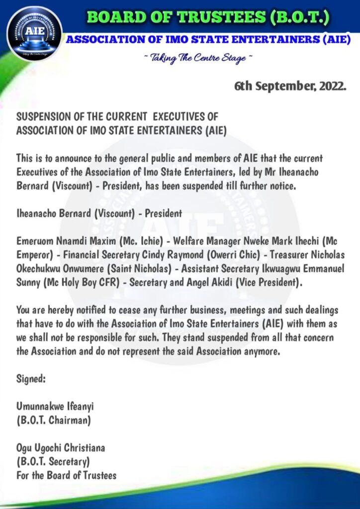 The Association of Imo State Entertainers (AIE) has on the 6th of September suspended their currect Executives.