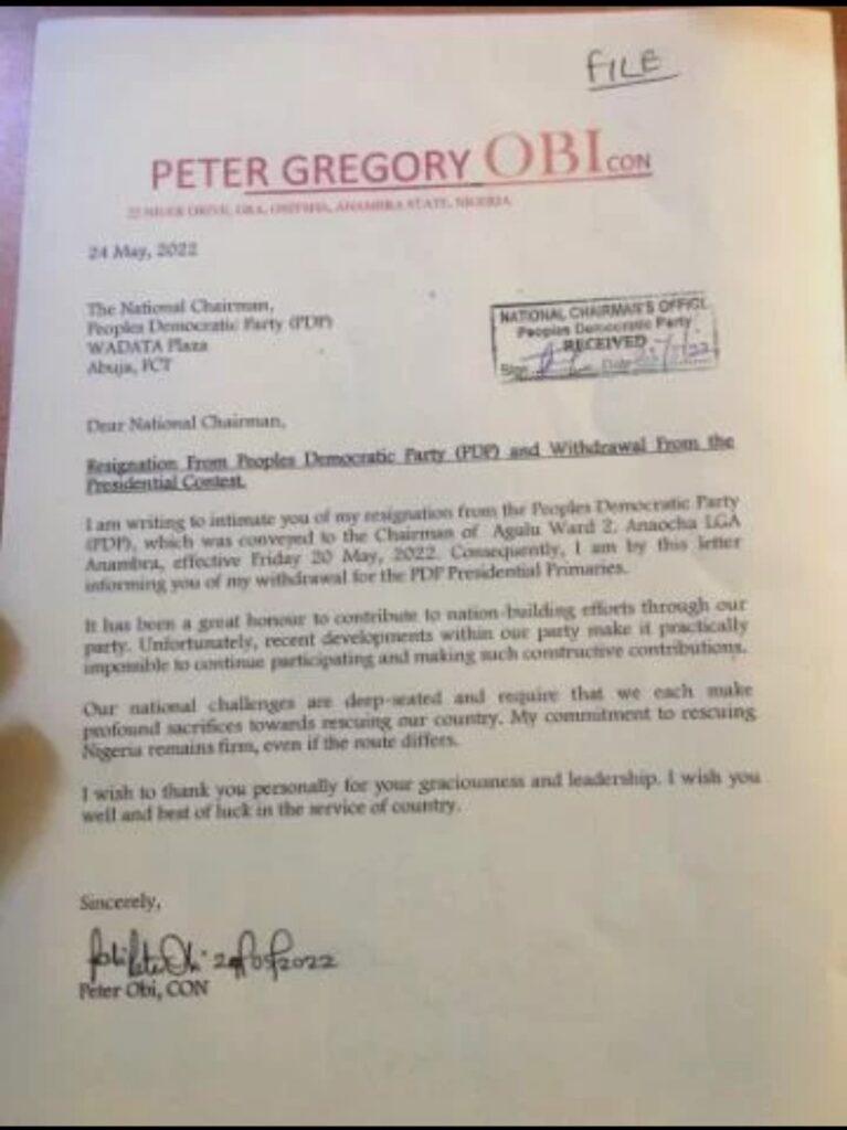 Obi announced his resignation in a letter dated 20, addressed to the National Chairman of the party.