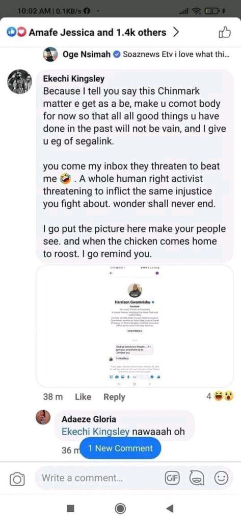 you come my inbox dey threaten to beat me. A whole human right activist threatening to inflict the same injustice you fight about. Wonders shall never end.