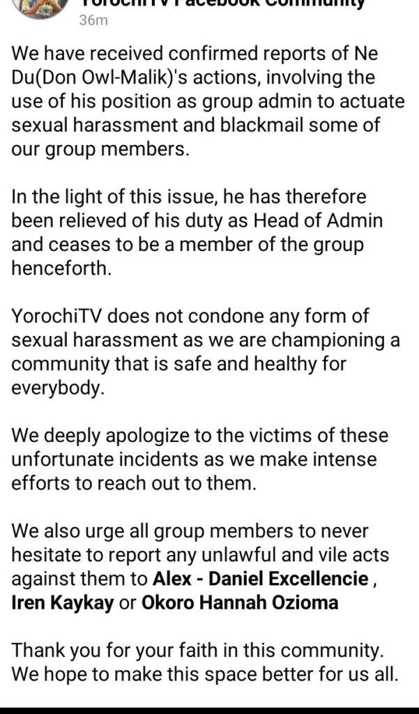 Ichie David, the owner and founder of yorochitv had to remove him from the group to protect the community standard.